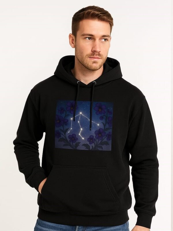 € 65.00This hoodie features a glowing constellation of white star points and connecting lines, encircled by a serene wreath of delicate daisies against the dark fabric.