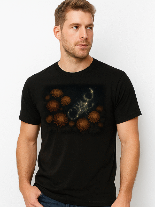 € 65.00A bold black tee featuring glowing abstract swirls surrounded by brown-orange chrysanthemums—where floral warmth meets radiant energy.