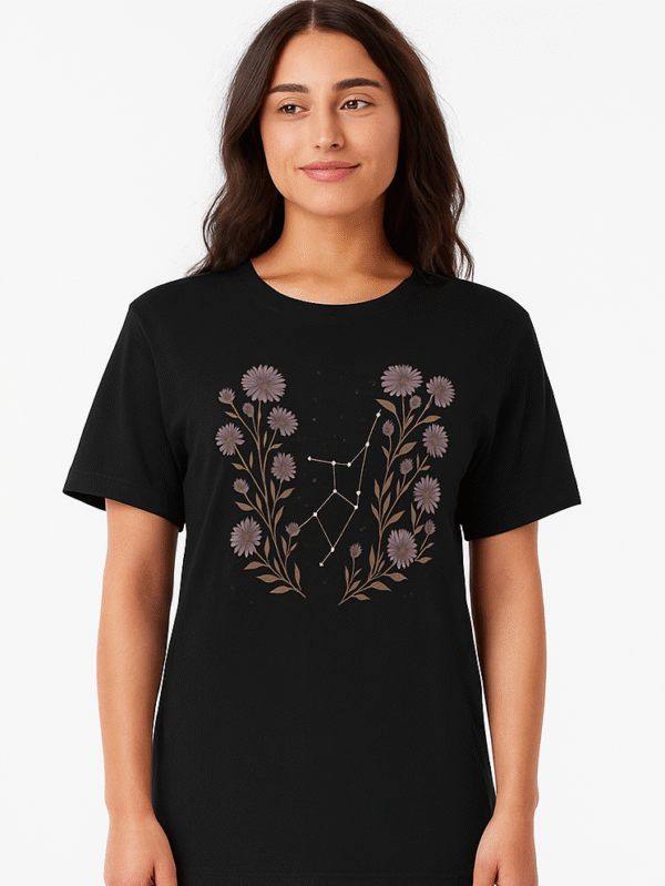 € 65.00A sleek black tee featuring a central constellation surrounded by symmetrical purple flowers—where astronomy meets nature.