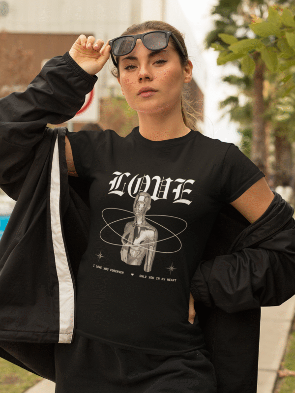 € 65.00Trendy black t-shirt featuring a bold "LOVE" graphic with a futuristic metallic figure, perfect for athleisure and casual wear.