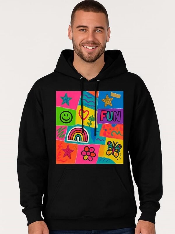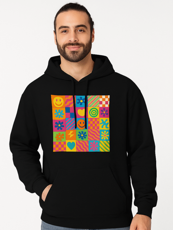 Brighten your wardrobe with this playful black hoodie featuring a vibrant collage of smiley faces, hearts, rainbows, and more. A cozy celebration of joy and color.