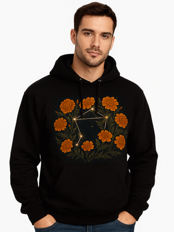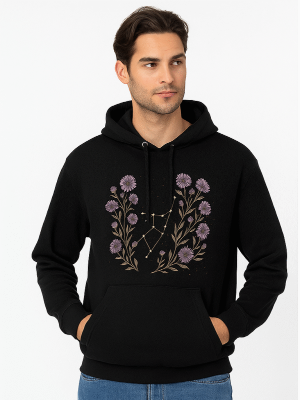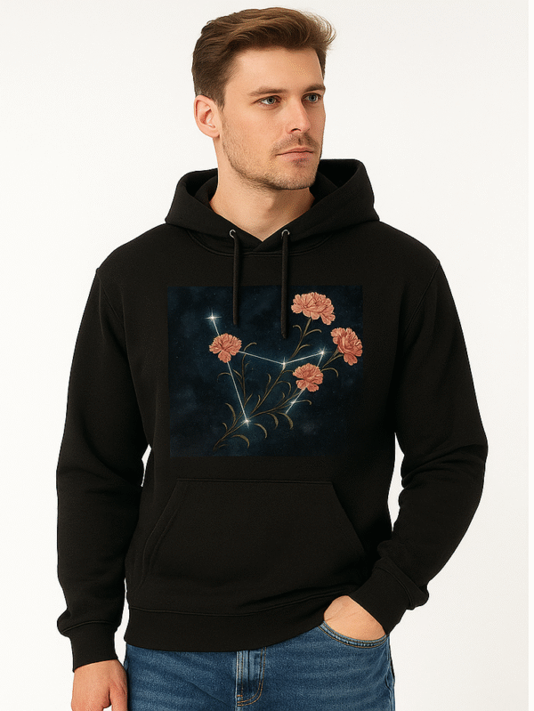 A cozy black hoodie that blends cosmic wonder with botanical beauty—featuring a constellation and symmetrical blue floral accents.