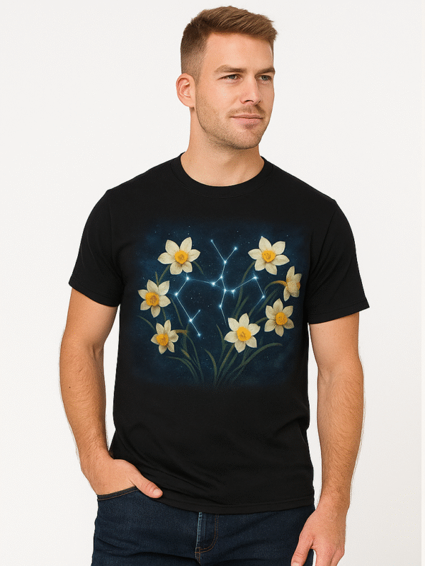 € 65.00A black hoodie featuring vibrant yellow daffodils connected by constellation lines against a starry night sky—where flowers bloom among the stars.