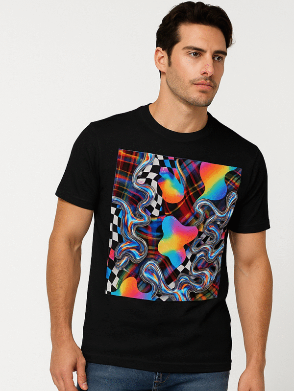 € 65.00A bold black men's t-shirt with a vibrant rainbow swirl pattern, ideal for a striking and trendy casual look.