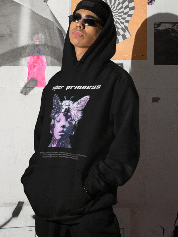 € 65.00Step into your glitchy fairytale era with the Cyber Princess Hoodie—a wearable manifesto of holographic glam and insect-inspired mystique.