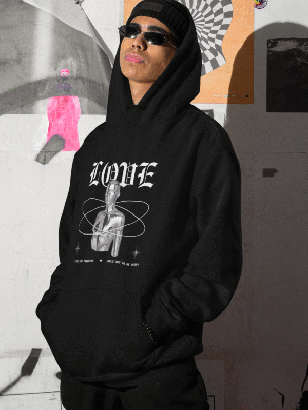 € 65.00Declare your devotion in style with the LOVE Forever Hoodie. Featuring a bold “LOVE” header and a stunning graphic of a metallic human figure.