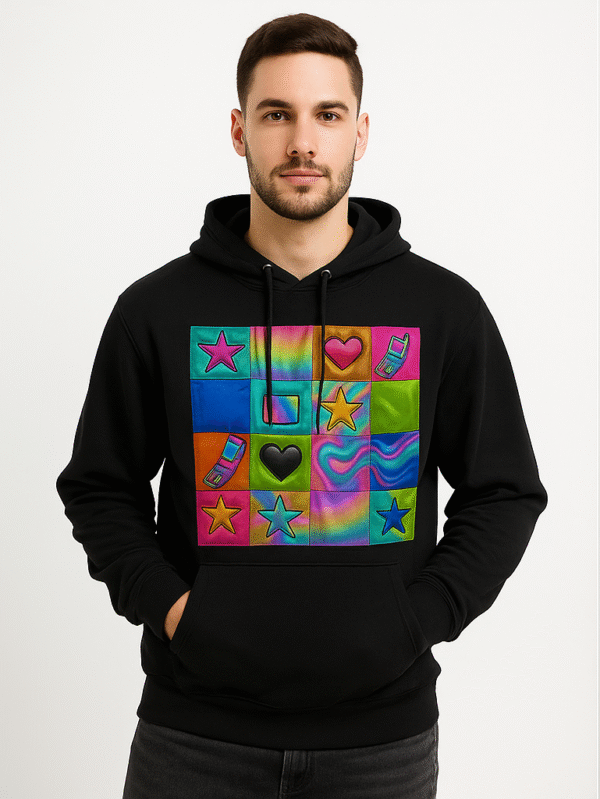 € 65.00The Pixel Star (PS) Hoodie is a graphic explosion of movement, color, and layered meaning. Crafted from a soft, comfortable cotton-poly blend.