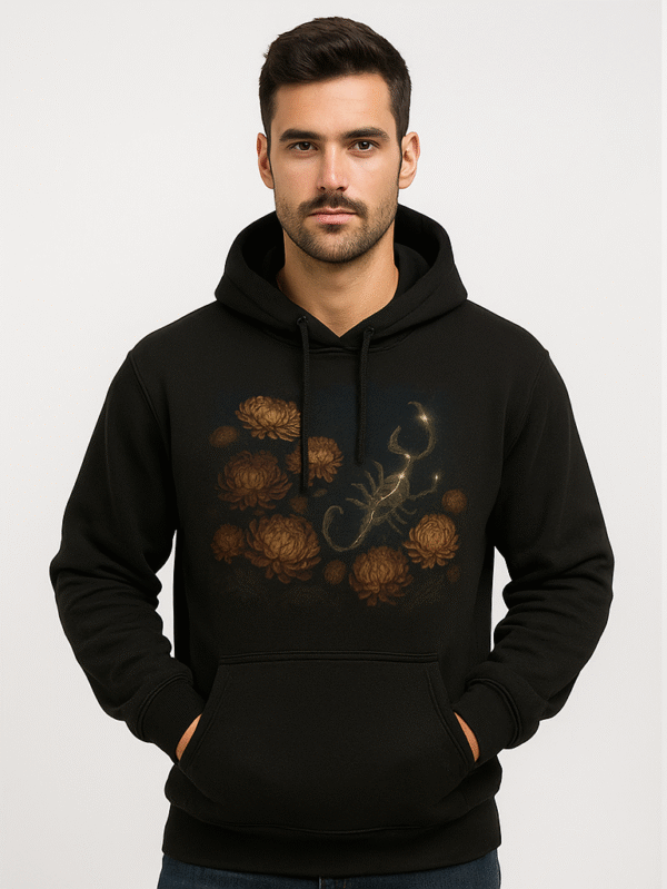 € 65.00A bold black hoodie featuring a glowing scorpion surrounded by earthy-toned flowers—where mysticism meets nature.Scorpio zodiac and astrology lovers