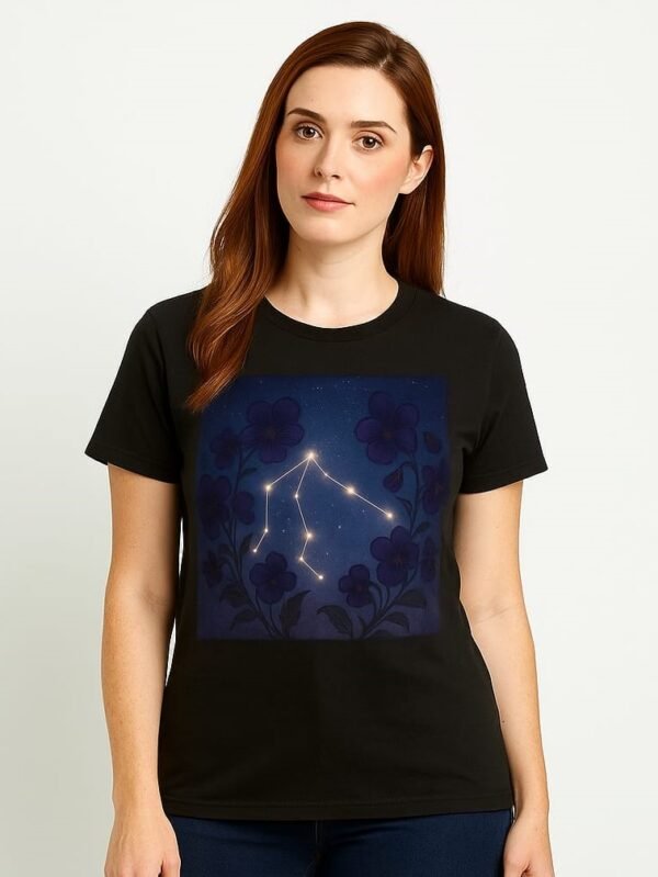 € 65.00A black tee that blends floral elegance with celestial charm—featuring red roses, green leaves, and a constellation on a twilight sky.
