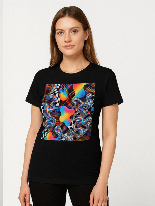 € 65.00A chic black women's t-shirt with vibrant neon wave patterns in pink, blue, and green, offering a bold, stylish streetwear look for any occasion.
