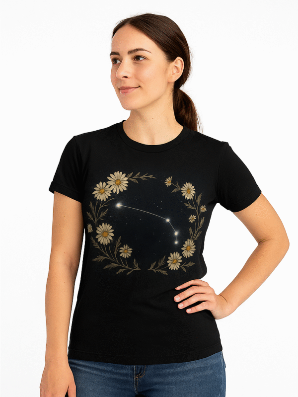 € 65.00A cosmic black tee featuring a constellation framed by yellow daisies and earthy leaves—where starlight meets wild bloom.