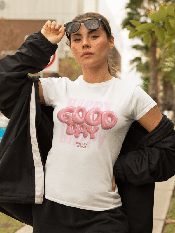 € 65.00Brighten your day with this fun white "Good Day" t-shirt, styled with a black jacket, sunglasses, and a cool urban pose.