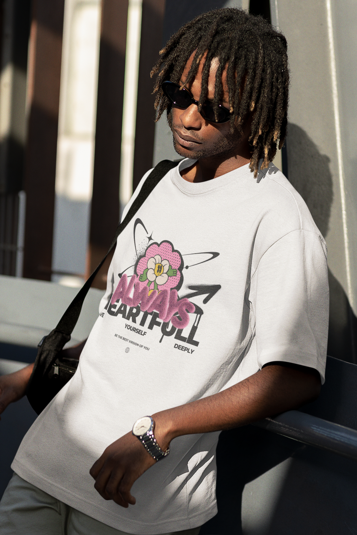 Radiate kindness and confidence with the ALWAYS HEARTFULL T-Shirt, a white unisex tee that blends bold streetwear with heartfelt affirmations. Crafted from soft cotton with a relaxed fit, this shirt features a joyful pink flower with a smiley face, abstract black-and-white shapes, and uplifting “ALWAYS HEARTFULL” text, paired with reminders to “LOVE YOURSELF DEEPLY” and “BE THE BEST VERSION OF YOU.” Perfect for mental health advocates, aesthetic fashion lovers, and those embracing self-love, this tee is a vibrant expression of warmth and style.