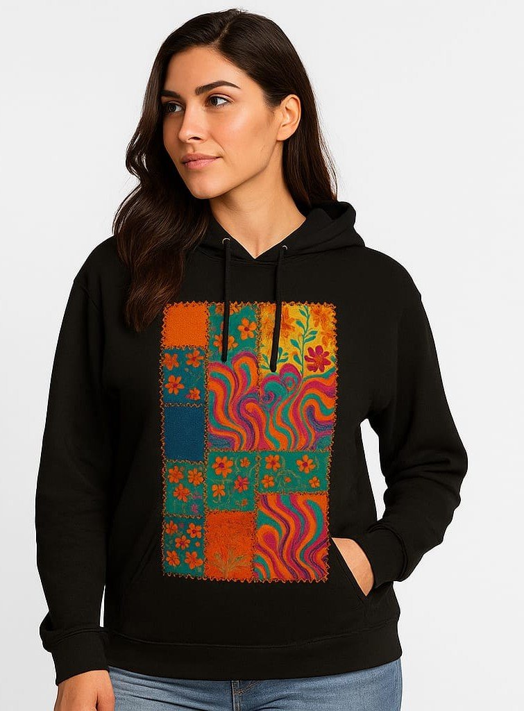 Bring vibrant energy to your style with the Boho Patchwork Women’s Hoodie, a bold black pullover that radiates free-spirited charm with a colorful mix of retro floral and abstract wave patterns in rich orange, teal, pink, and yellow. Crafted from soft, breathable cotton-poly blend with a cozy fleece interior and relaxed women’s fit, this hoodie features a front kangaroo pocket and adjustable drawstring hood for ultimate comfort. Perfect for festival-goers, bohemian fashion lovers, and retro style enthusiasts, this piece is ideal for casual wear, travel, or cozy evenings outdoors.