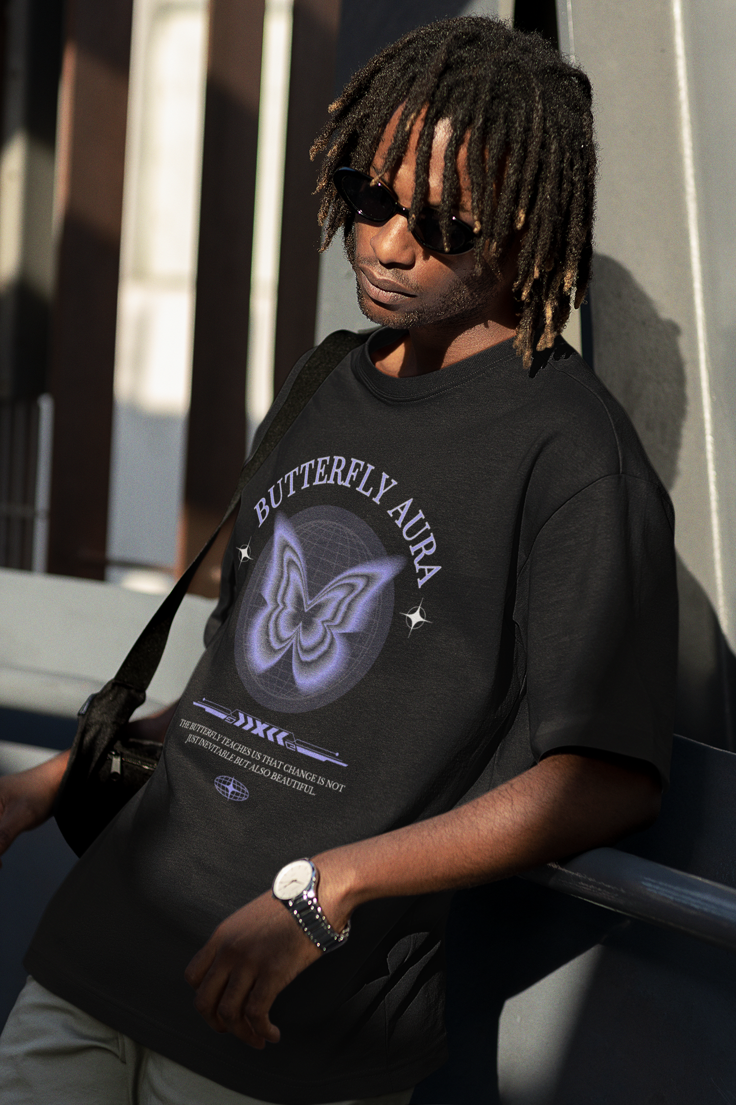 Embrace transformation with the Butterfly Aura T-Shirt, a radiant tribute to personal evolution and inner light. Crafted from soft black cotton with a relaxed unisex fit, this tee features a glowing purple butterfly framed by geometric accents and an inspiring quote: “The butterfly teaches us that change is not just inevitable but also beautiful.” Perfect for spiritual fashion lovers, mindful streetwear fans, and those on a journey of growth, this shirt is a wearable mantra for soulful style.