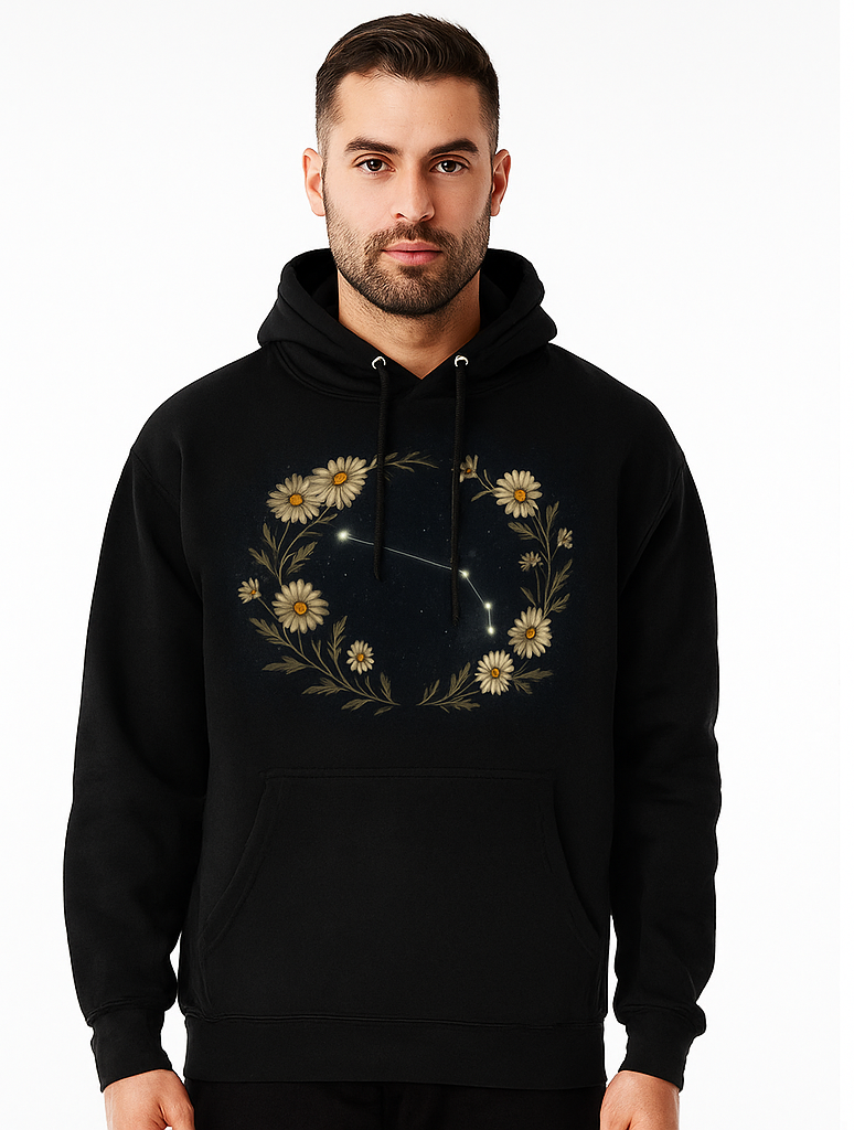 Step into a universe of style with this celestial-meets-botanical black hoodie. The front showcases a striking constellation rendered in crisp white dots and lines, framed by a wreath of charming daisies. It’s a perfect fusion of cosmic curiosity and earthy elegance, designed for dreamers, stargazers, and nature lovers alike.