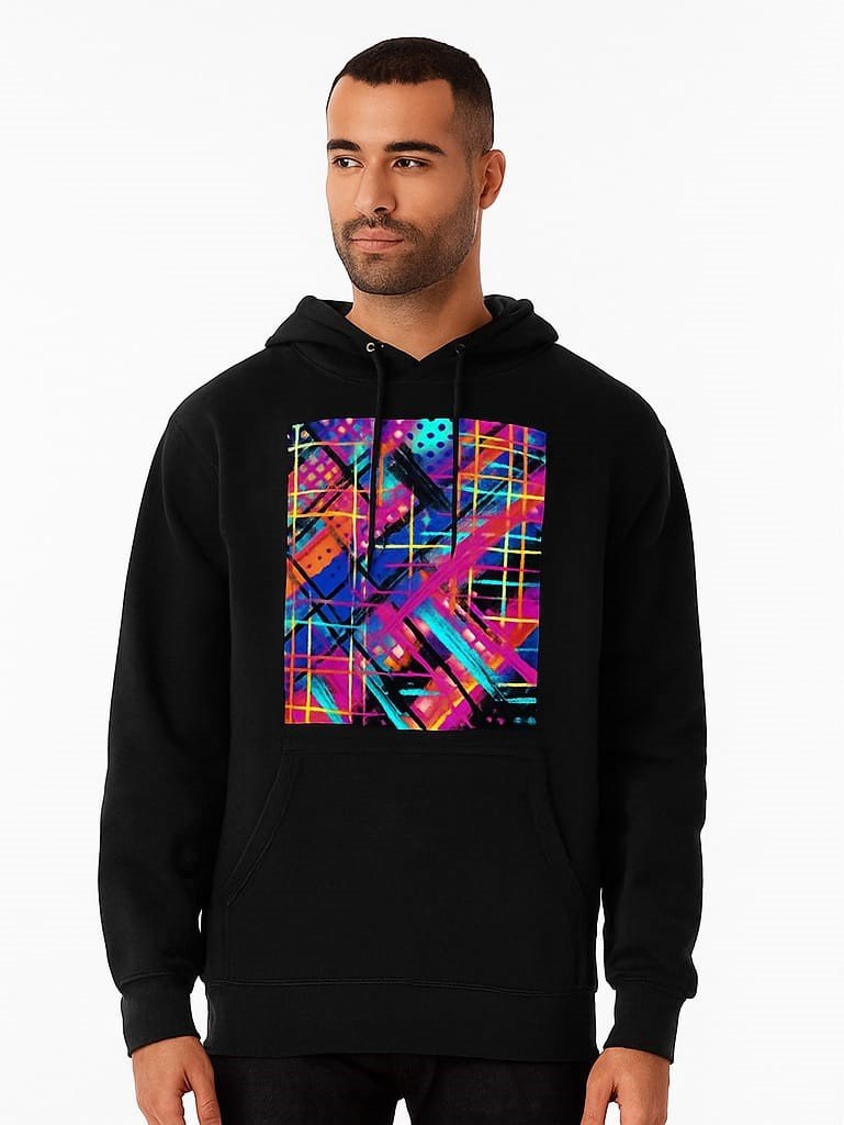 Make a bold statement with the Neon Chaos Hoodie, an electrifying black pullover that fuses fashion with vibrant abstract art. Crafted from a soft cotton-poly blend with a cozy fleece interior and relaxed unisex fit, this hoodie features a vivid front design of intersecting neon lines and geometric shapes in pink, blue, yellow, and orange, popping against the black base. Perfect for fans of modern art, rave culture, and bold streetwear, this piece is ideal for hitting the streets, lounging in style, or gifting to creatives and color lovers.
