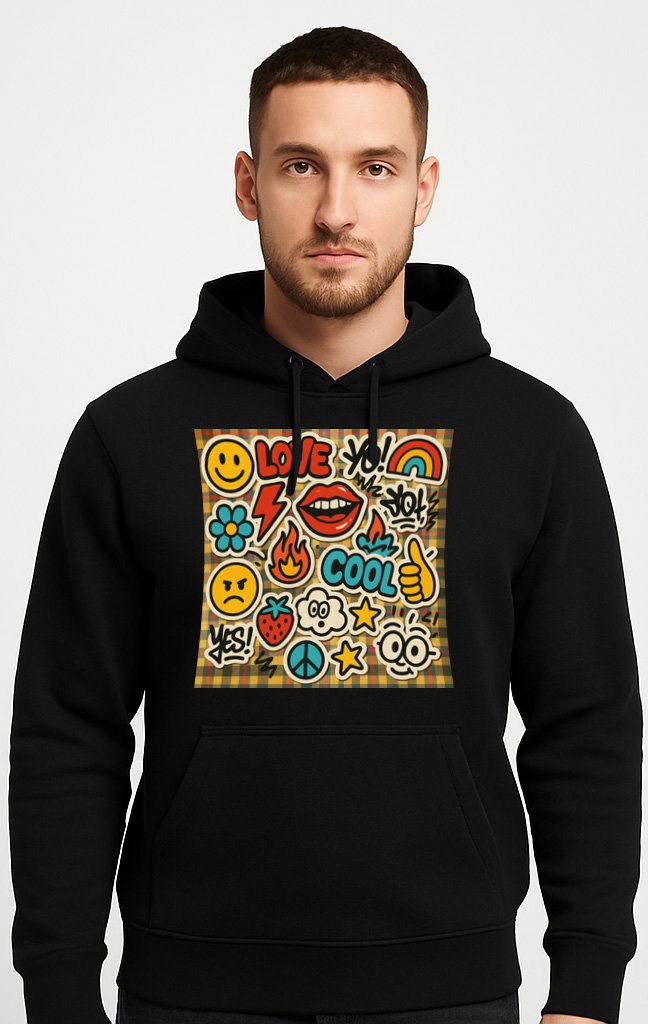 Make a bold statement with the Playful Cartoon Hoodie, a striking black pullover that bursts with a vibrant collage of cartoon-style icons and expressive flair. Crafted from a soft cotton-poly blend with a cozy fleece interior and relaxed unisex fit, this hoodie features a lively front graphic with a smiley face, rainbow, lightning bolt, red lips, peace sign, strawberry, and bold phrases like “LOVE,” “COOL,” and “YES!” layered over a plaid-style background. Perfect for fans of expressive fashion, Y2K vibes, and dopamine dressing, this piece is ideal for casual outings, gifting to creatives, or rocking bold streetwear style.