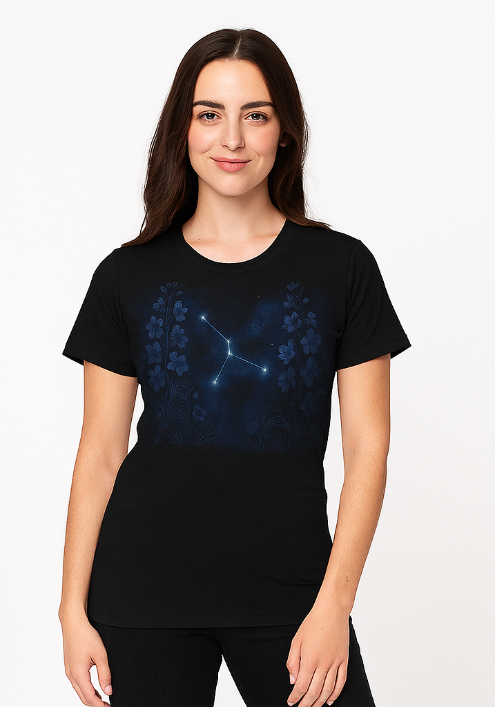 Channel the serene beauty of a starry night with the Moonlit Constellation T-Shirt, a captivating black tee that blends celestial wonder with floral artistry. Crafted from a lightweight cotton blend with a relaxed unisex fit, this shirt features a central constellation of stars and connecting lines, surrounded by rich dark blue floral patterns against a night sky effect, evoking a moonlit garden vibe. Perfect for astrology fans, nature lovers, and botanical fashion enthusiasts, this tee offers timeless elegance for cosmic dreamers.