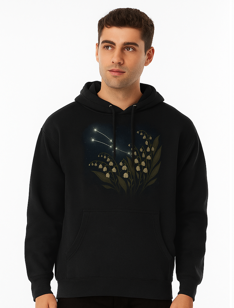 Wrap yourself in poetic serenity with the Stargazing Lilies Hoodie, a black pullover that blends celestial magic with springtime charm. Crafted from a soft cotton-poly blend with a cozy fleece interior and relaxed unisex fit, this hoodie features a glowing constellation of stars connected by fine lines above a serene cluster of lily of the valley flowers, with delicate white blooms and lush green leaves. Perfect for nature lovers, astronomy fans, and expressive fashion enthusiasts, this piece radiates quiet beauty and cosmic wonder.