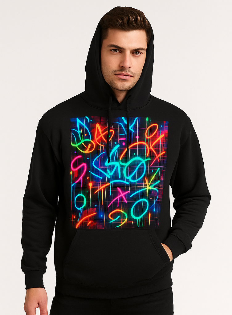 This black hoodie is a visual explosion of neon creativity. The front graphic features a dynamic mix of abstract shapes—circles, stars, squiggles, and lines—arranged in a freeform pattern that feels spontaneous and electric. The neon colors pop vividly against the black background, creating a look that’s bold, artistic, and full of movement. Perfect for creatives, festival-goers, and anyone who loves expressive fashion with a twist.