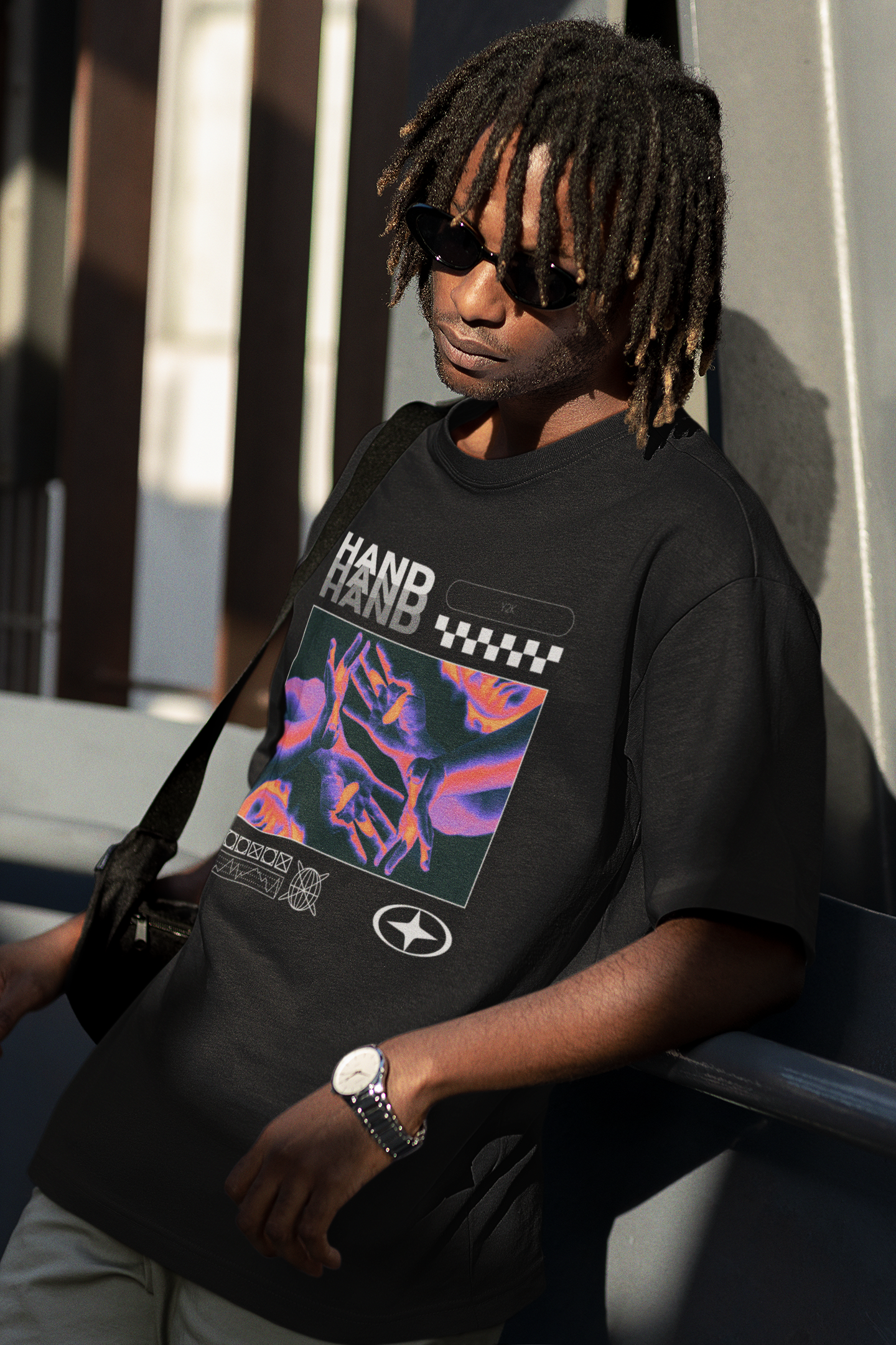 Dive into a surreal digital dreamscape with the HAND HAND T-Shirt, a bold celebration of abstract expression and glitchcore aesthetics. Crafted from soft black cotton with a relaxed unisex fit, this tee features a warped, colorful hand graphic layered with geometric symbols, checkered accents, and cryptic “HAND HAND” typography, evoking connection and distortion. Perfect for vaporwave enthusiasts, abstract art lovers, and streetwear collectors, this shirt delivers art-forward rebellion with a futuristic edge.