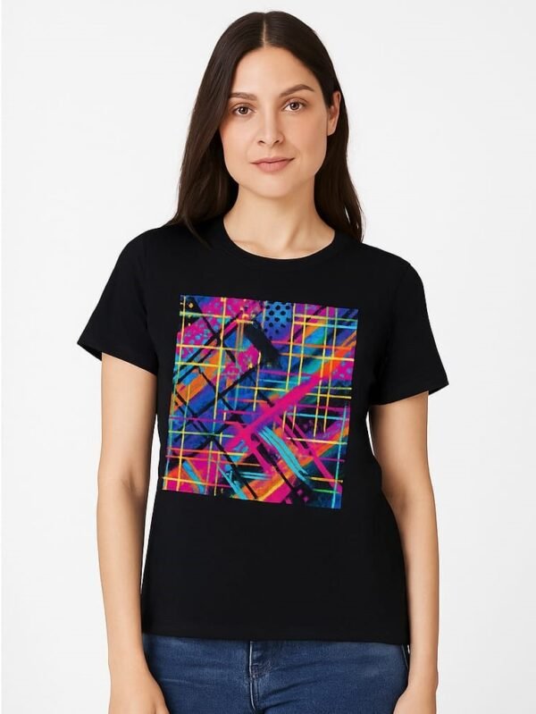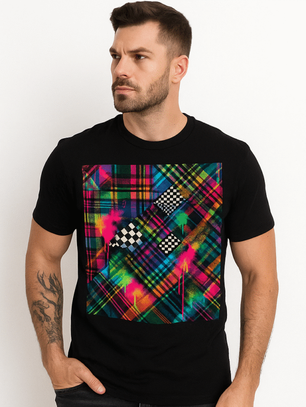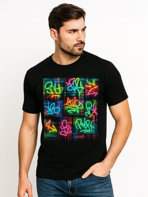 A black tee lit with neon energy—featuring graffiti-inspired shapes and lines in vibrant hues for bold, expressive streetwear.