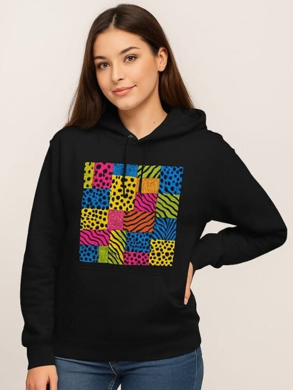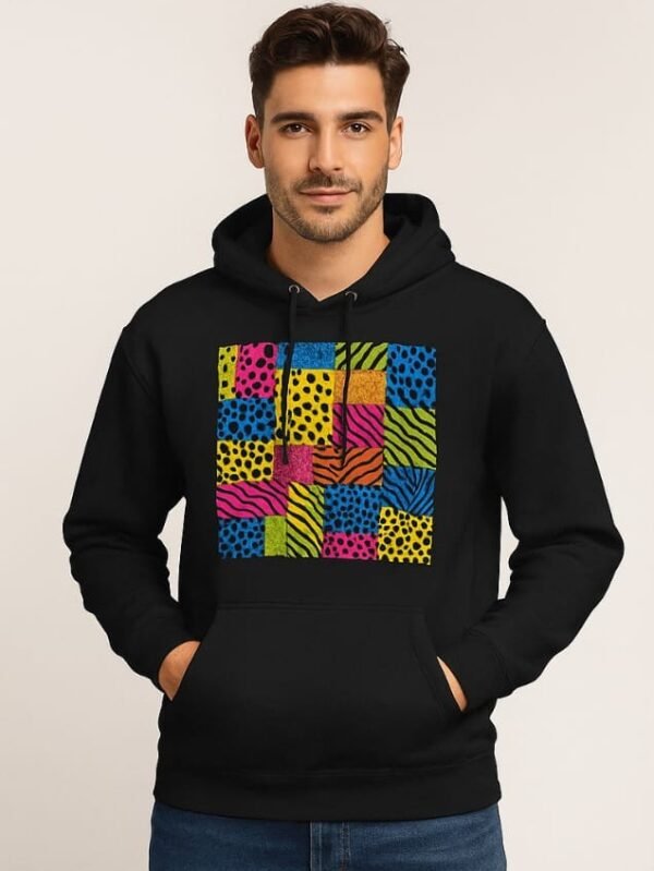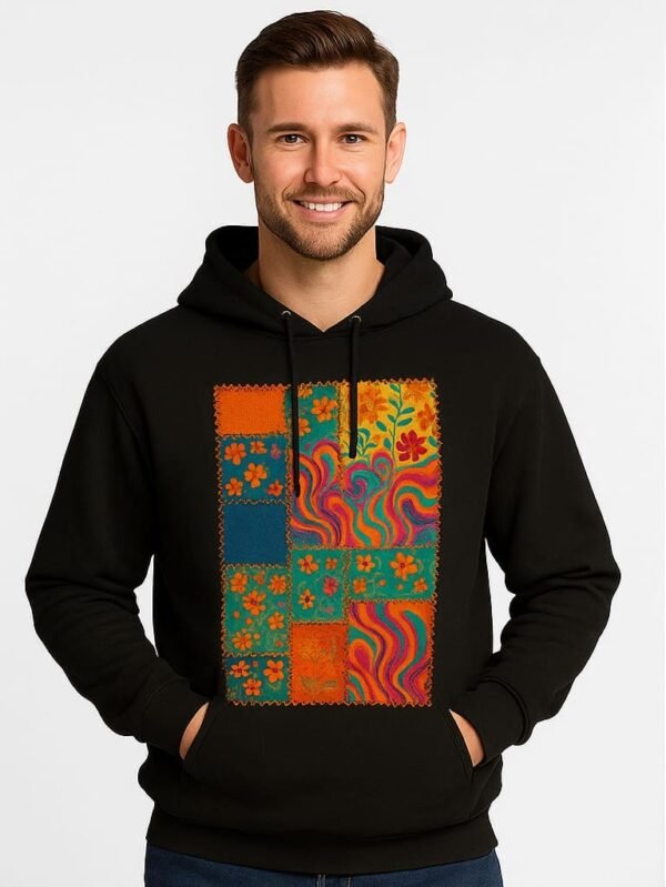 This black hoodie features a bold 9-square patchwork design—each square bursting with color, floral motifs, and abstract swirls for a truly artistic statement piece