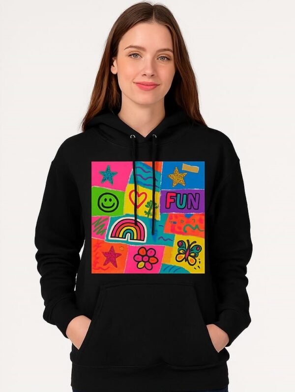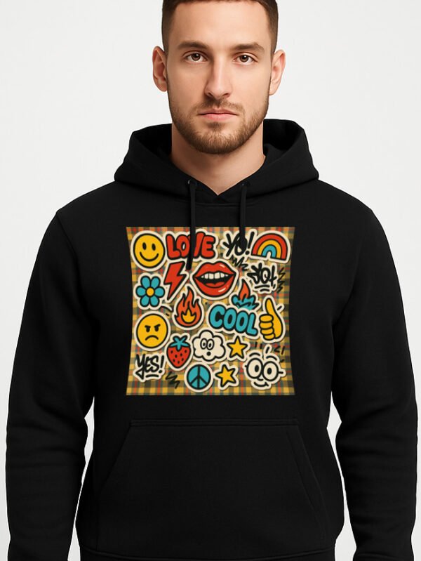 Brighten your wardrobe with this playful black hoodie featuring a vibrant collage of smiley faces, hearts, rainbows, and more. A cozy celebration of joy and color.