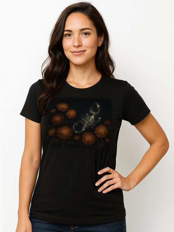 A sleek black tee featuring brown floral clusters and glowing spark-like lines—where earthy tones meet radiant energy.