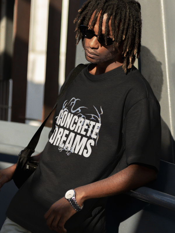 Dream in steel and smoke. The “Concrete Dreams” tee is a tribute to urban ambition and artistic grit. Urban fashion lovers