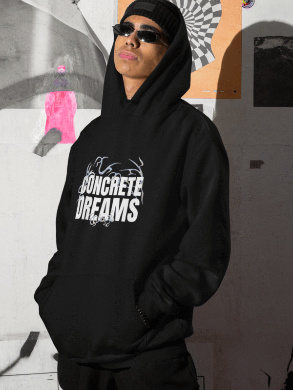 Discover the ultimate urban fashion statement with the Concrete Dreams Hoodie! This sleek black hoodie features a bold, eye-catching design